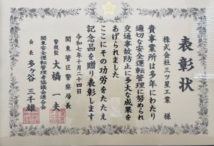 この度弊社は、令和7年度関東管区警察局長・関東安全運転管理者協議会連合会長 交通安全優良事業所を受賞しました。